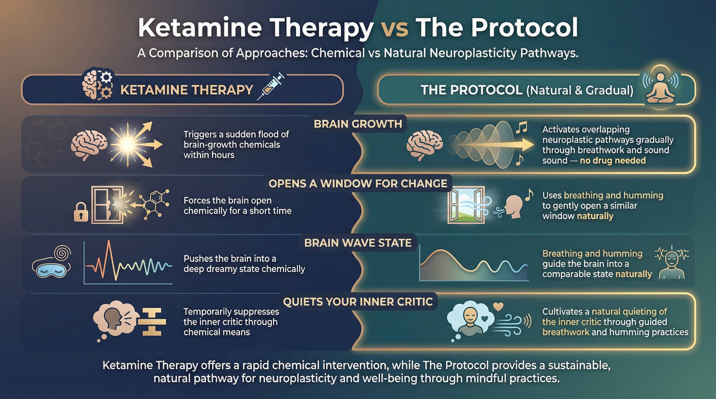 This visual compares ketamine’s pharmacological effects with our protocol’s physiological approach. Both increase brain adaptability, but our method is substance-free, safe, and fully within your control..